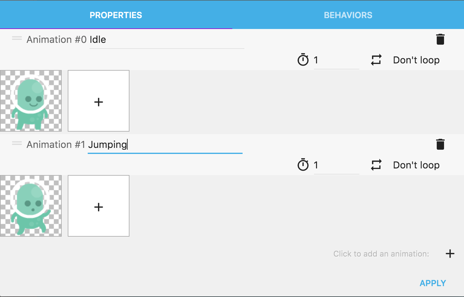 Abra el editor del objeto Player y asegúrese de estar en la pestaña Propiedades. Luego haga clic en el botón + en la parte inferior de la ventana para agregar una animación. Finalmente, haga clic en la miniatura con el signo + de la nueva animación y elija p1_jump como la imagen a agregar: