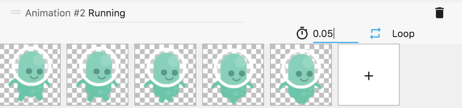 Estas imágenes se mostrarán para crear la animación. Necesitamos ajustar un poco algunas opciones. Primero, haga clic en No hacer bucle para cambiar esta opción a Bucle. Esto hará que la animación se reinicie cuando se llegue al final. El temporizador muestra el tiempo en segundos entre cada imagen: esta es la velocidad de la animación. Ingrese 0.05 en lugar de 1 para que la animación se reproduzca más rápido: