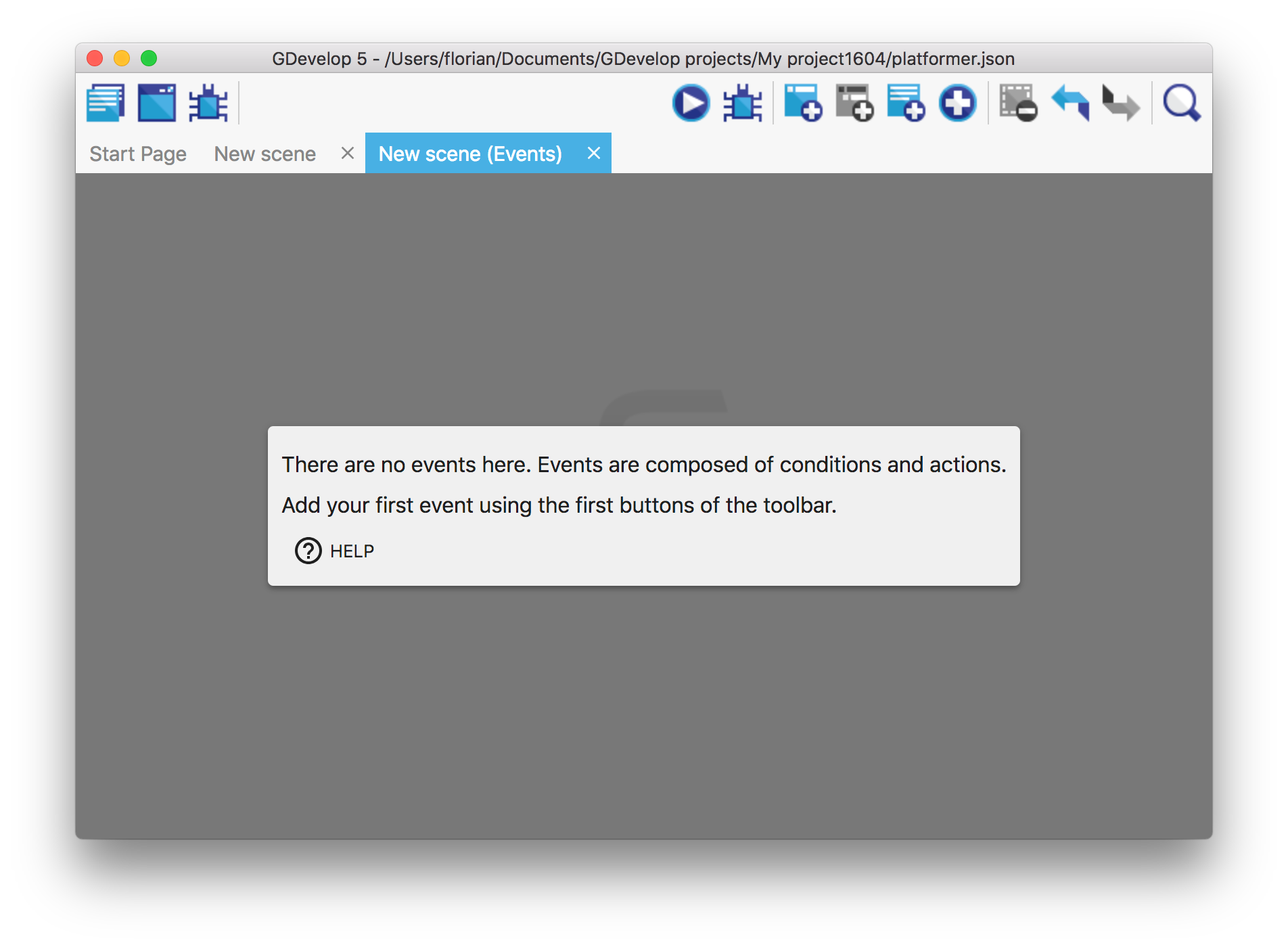 Abra el editor de eventos de la escena haciendo clic en la pestaña llamada Nueva escena (eventos).