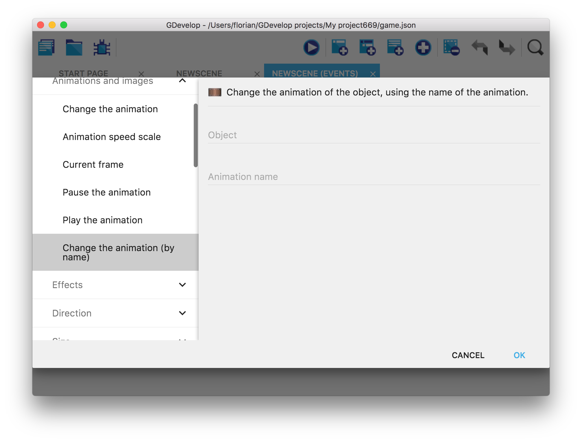 Vamos a cambiar la animación del jugador, que es un objeto Sprite. Abra la categoría Sprite, luegoAnimaciones y finalmente elija Cambiar la animación (por nombre).