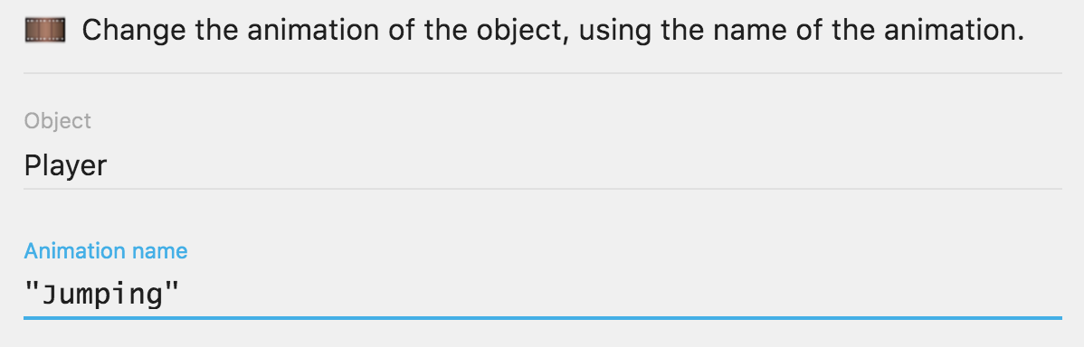 Seleccione el objeto Player para el primer parámetro y escriba"Saltando"en el segundo campo. Cuidado, tiene que escribir las comillas dobles, ya que cualquier texto en las acciones o condiciones de GDevelop también se puede generar mediante una fórmula, por lo que es necesario usar comillas dobles para decirle a GDevelop que este es un texto: