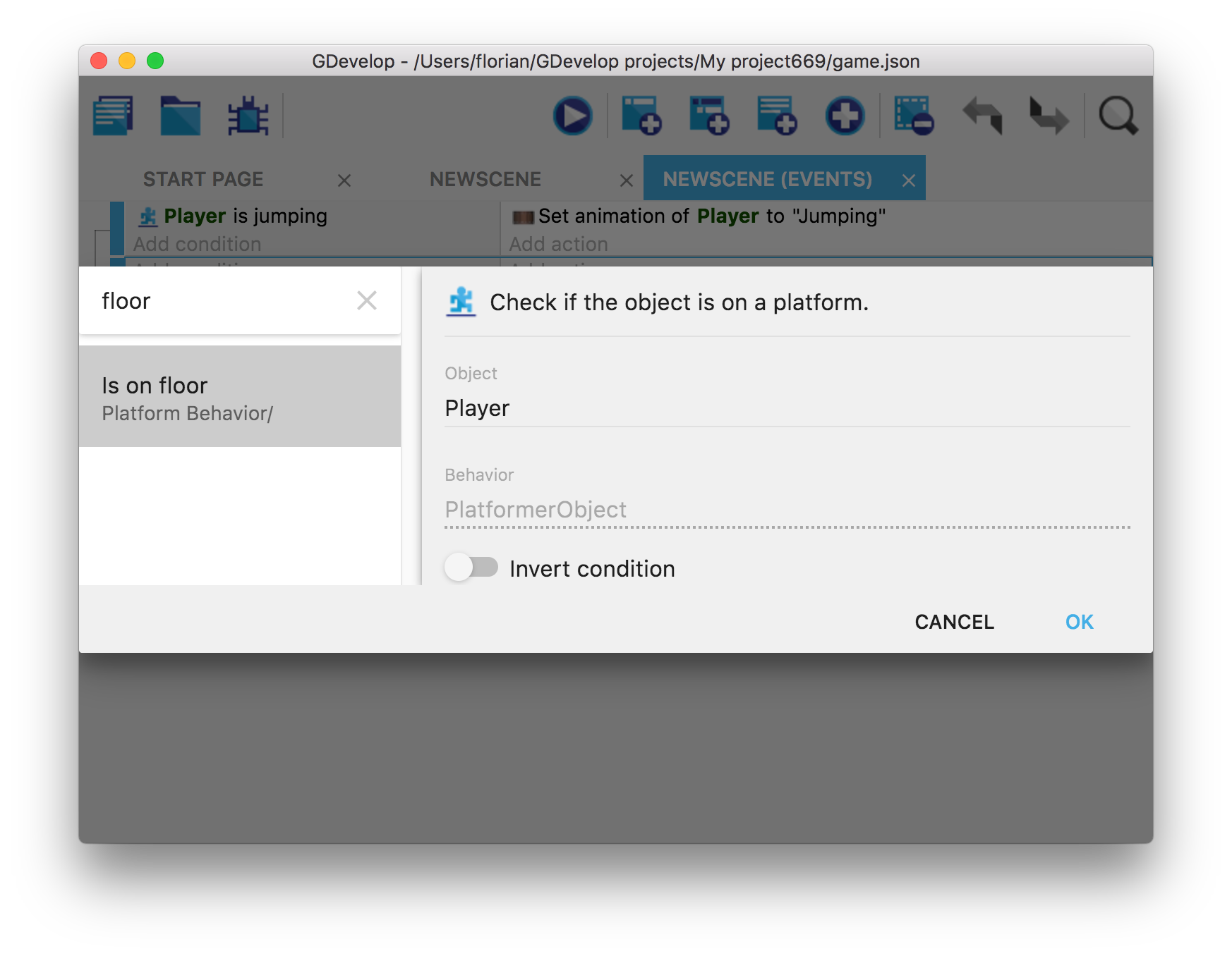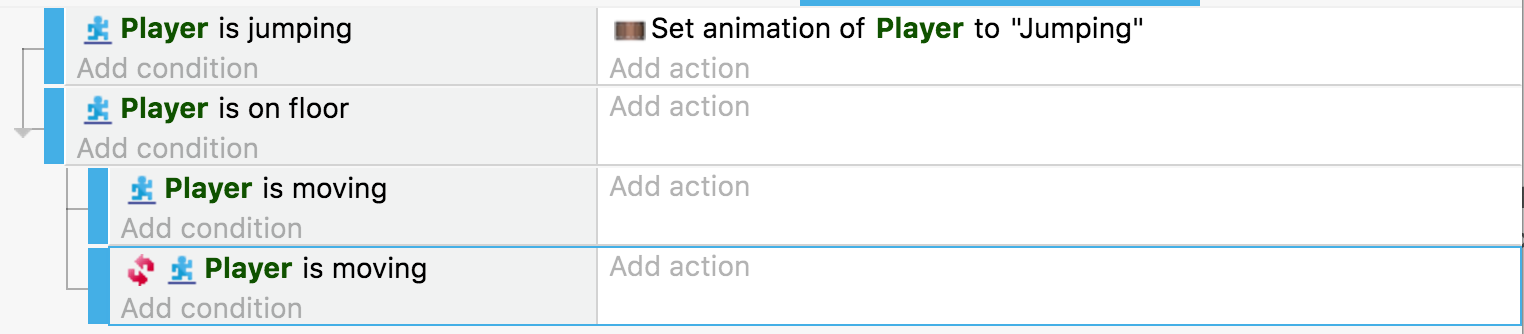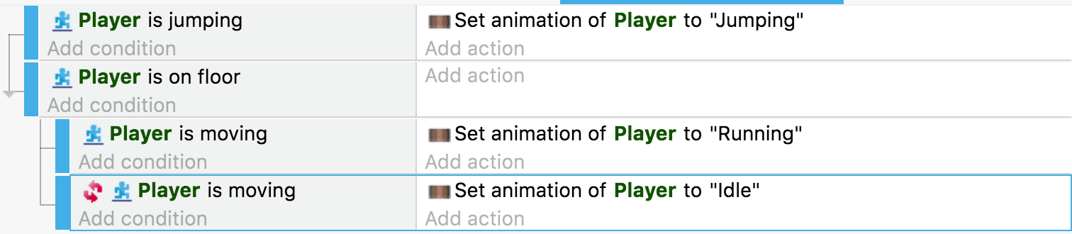 Para la segunda, agregue la misma condición, pero marque la opción 'Invertir condición'. De esta manera, las acciones del evento se iniciarán cuando el objeto del Jugador NO se esté moviendo: