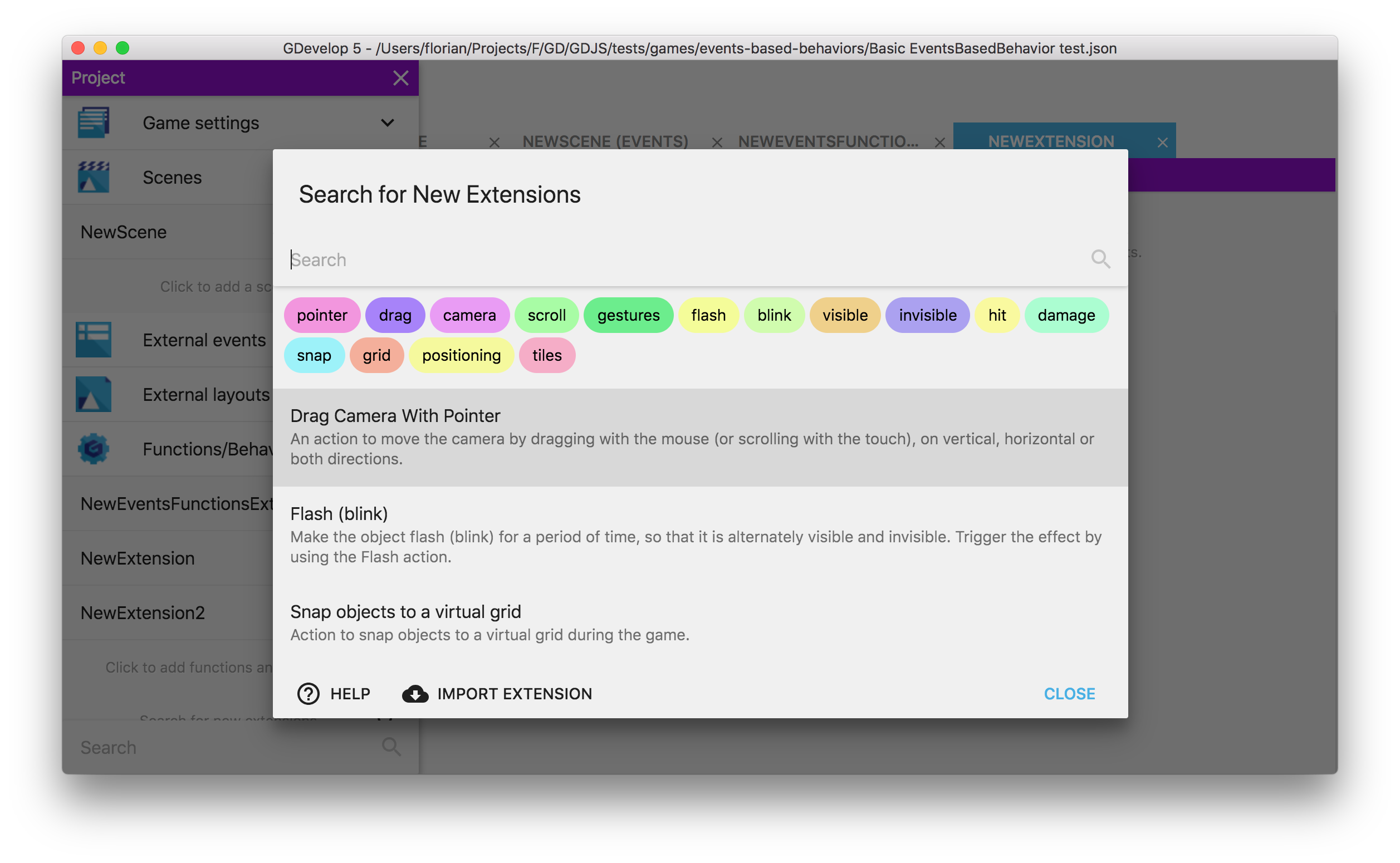 En plus de pouvoir accéder aux extension intégrées, tu as accès à pleins d'extensions faites par la communauté. Tu peux aussi créer tes propres extensions avec des Comportements, des Actions, des Conditions et des Expressions dans tes projets, les réutiliser dans d'autres projets et les partager.