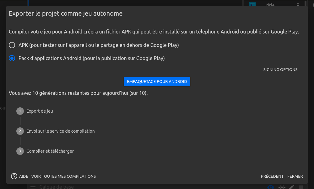 En tant qu'utilisateur connecté à GDevelop, vous pouvez exporter votre jeu 2 fois par jour pour Android