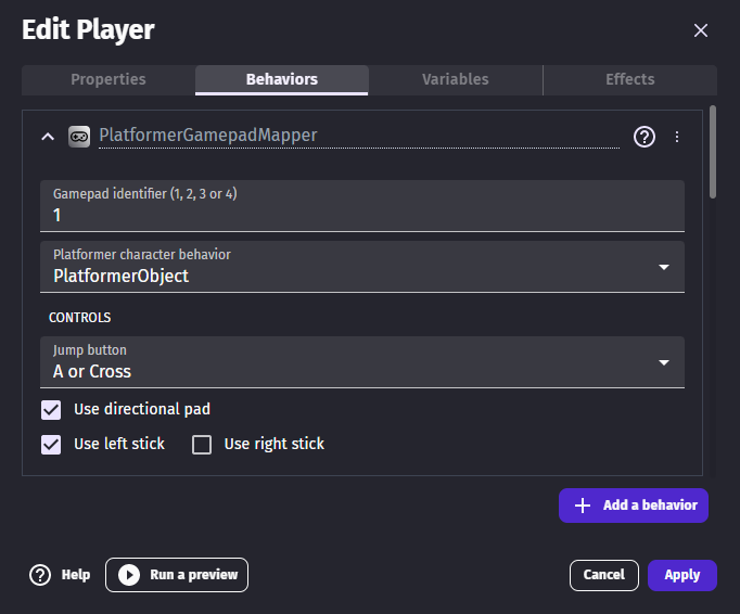 The "Platformer gamepad mapper" behavior can be added to the character to make the character move according to player inputs automatically.