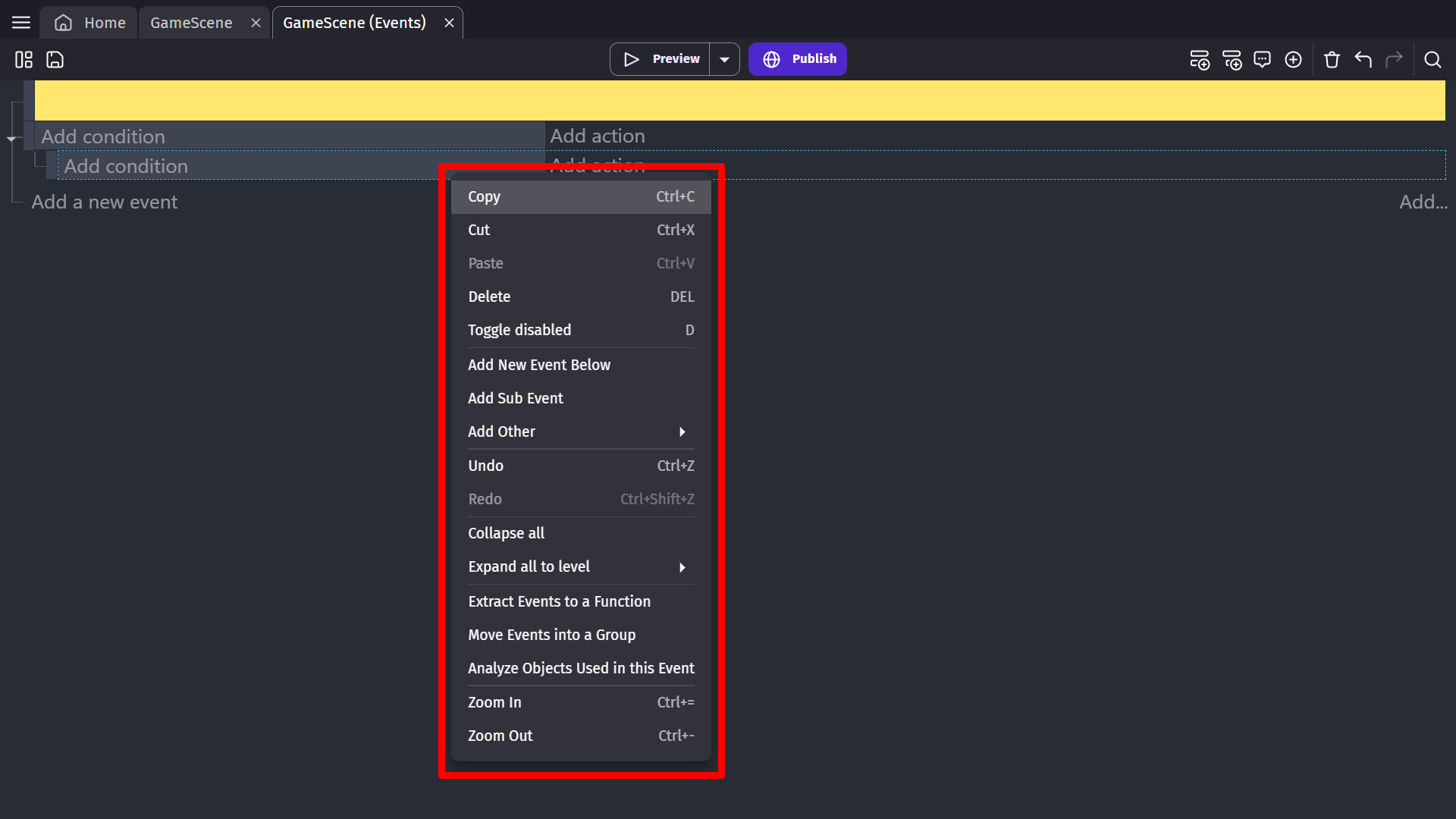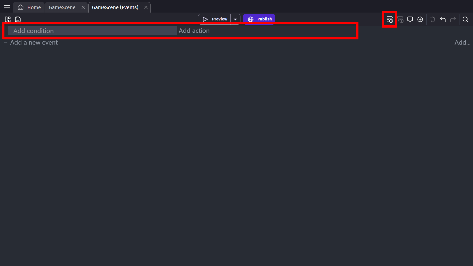 You can add any number of event blocks to the Event editor. Each event can have various conditions and actions. Once you add an event, you can use the conditions and actions to create the game's logic. Read more about conditions and actions.