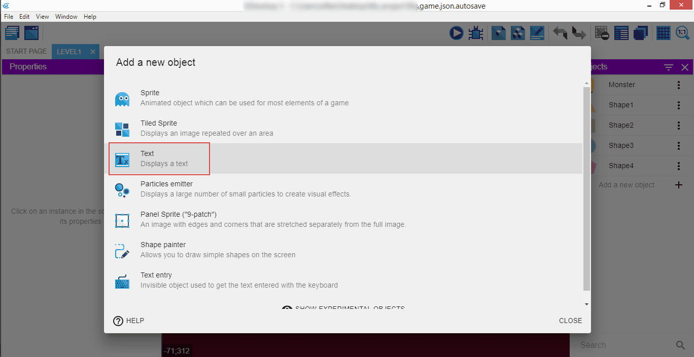Now switch to the "Level1" tab, find the "Score" object in the right panel, and drag it onto the scene.