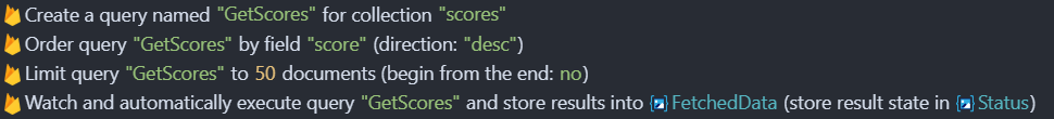 For the sake of this tutorial, we will load the 50 best scores. This can be achieved by adding the "Order by descending" and "Limit to 50 first" query filters. Then, we will watch the query to download the scores and have them update in real time.
