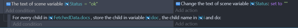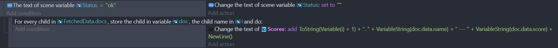 This allows to access the document via the variable doc inside that event and the position in the list via the variable i. For example, to access the position of a player you can use Variable(i) + 1. The + 1 is used as arrays start from 0, but leaderboards usually start from place 1. To access the score, in the context of this tutorial, you could use Variable(doc.data.score), and to access the username VariableString(doc.data.name). To display it all in a text object for example, we can use this: