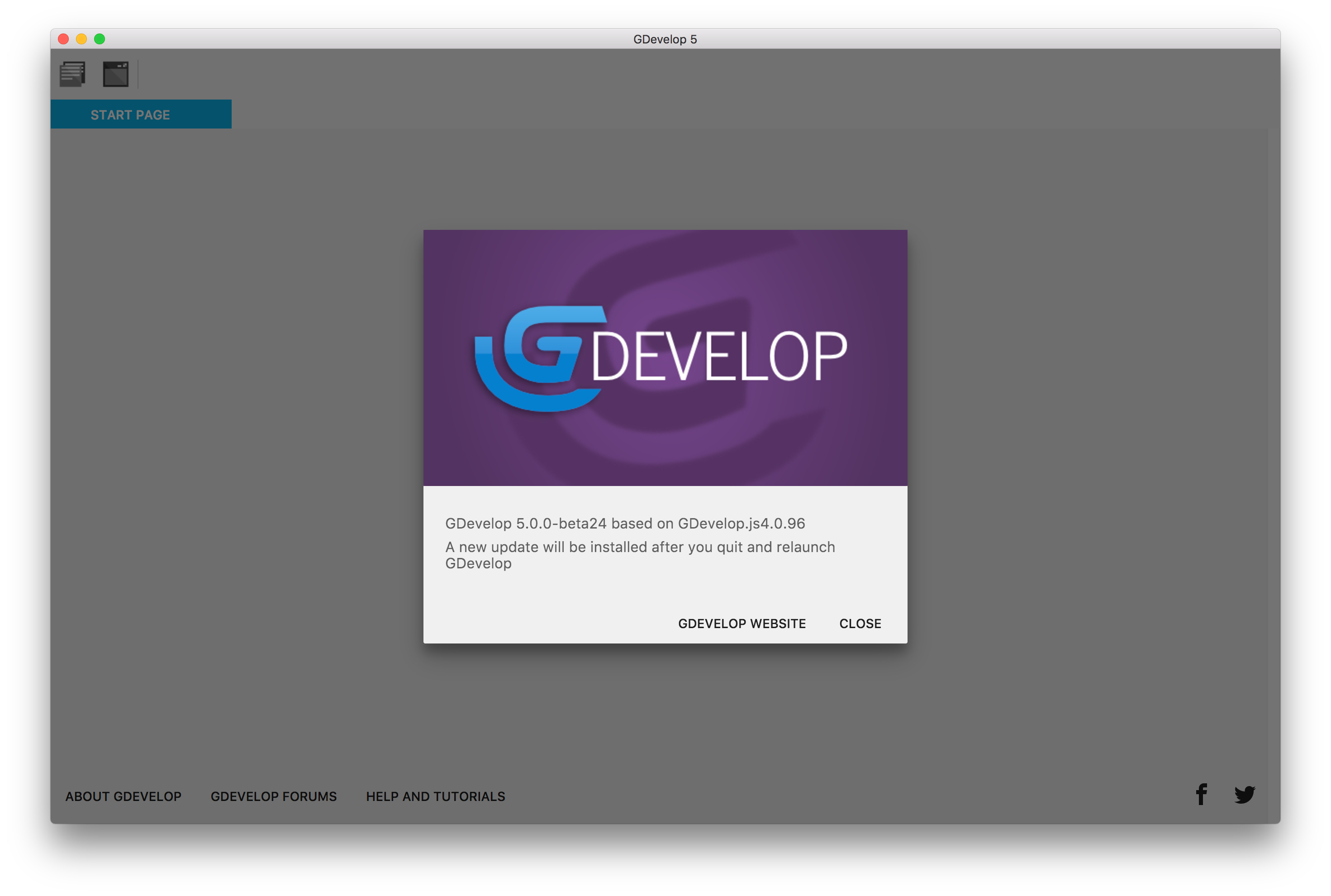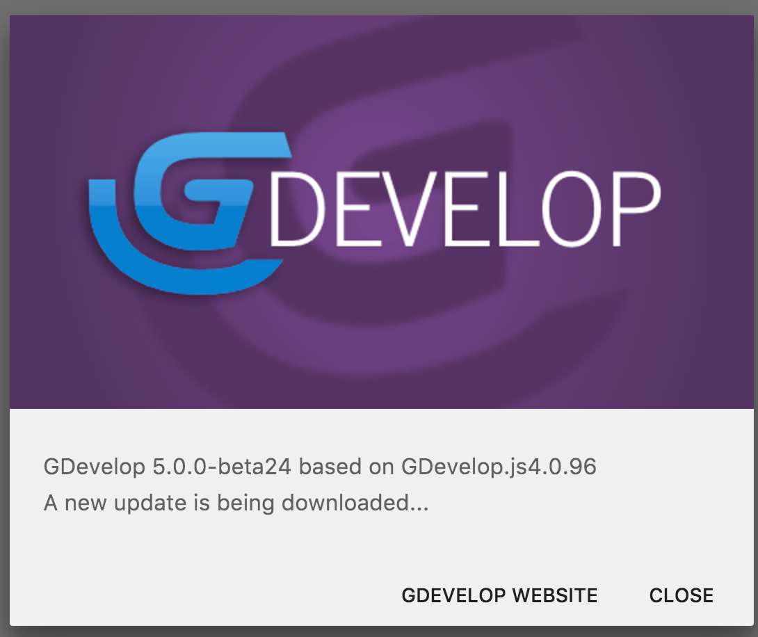 GDevelopは起動時に新しい更新を自動的に検索します。開始ページ のヘルプメニューからGDevelopについて のウインドウで、更新がダウンロードされているかを確認できます。